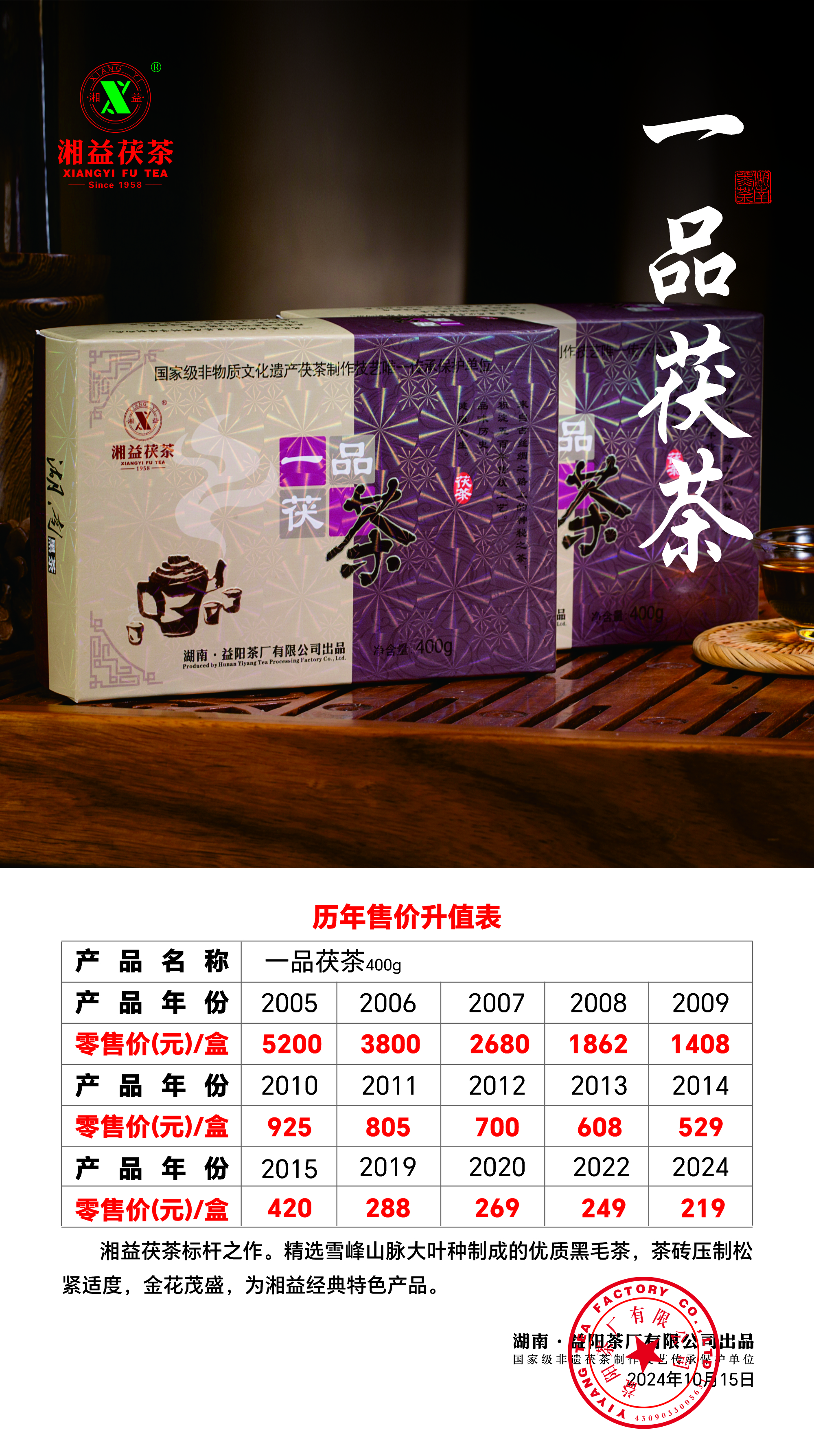 茯茶行業(yè)內(nèi)第一款中高檔產(chǎn)品是我司在2005年開發(fā)出的一品茯茶。它是湖南黑茶里程碑的產(chǎn)品,推動(dòng)了湖南黑茶的興盛發(fā)展,走在當(dāng)今茯茶品類中的前列。原料選用北緯30°黃金產(chǎn)地雪峰山脈大葉種制成的優(yōu)質(zhì)黑毛茶,并采用改良生產(chǎn)技術(shù)工藝制作,茶磚壓制松緊適度,金花茂盛,菌花香濃,湯色橙紅,為湘益經(jīng)典特色產(chǎn)品。