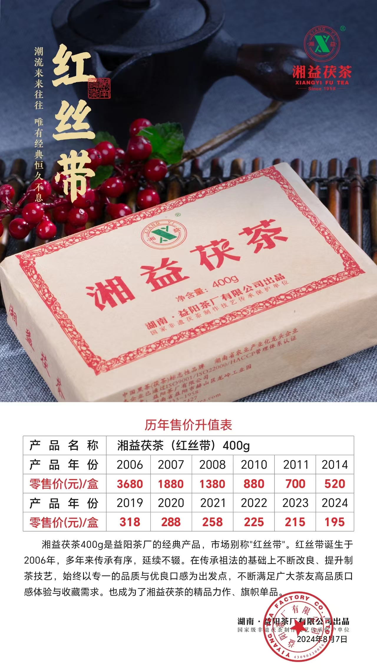 紅絲帶誕生于2006年,多年來傳承有序,延續(xù)不輟。它延續(xù)的不僅僅只是產(chǎn)品,更是精益求精的品質(zhì)與口感。湘益茶人在傳承祖法的基礎(chǔ)上不斷改良、提升制茶技藝,始終以獨(dú)特的品質(zhì)工藝與優(yōu)良口感為出發(fā)點(diǎn),不斷滿足廣大茶友高品質(zhì)口感體驗(yàn)與收藏需求。在制茶匠人數(shù)十年如一日的精雕細(xì)琢、茶友們?nèi)諒?fù)一日年復(fù)一年的口感認(rèn)證之下,紅絲帶成為了湘益茯茶的精品力作、旗幟單品。